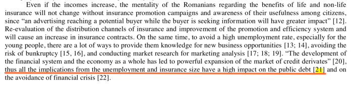 Articolul semnat Marcu nu a suflat nicio vorbă despre șomaj (număr, dinamică or costuri), asigurări sau prime de asigurare, iar articolul care îl citează, al lui Cristea, se numește ,,impactul ratei șomajului asupra dezvoltării (pieței) asigurărilor în România. O abordare statistică.” În fapt, Cristea îi întoarce lui Marcu frauda academică a acestuia din citarea fictivă în primul articol invocat, citându-l la rândul ei, fictiv. Subliniez, în articolul semnat de Marcu și Meghișan nu există nicio referire la șomaj și piața asigurărilor.