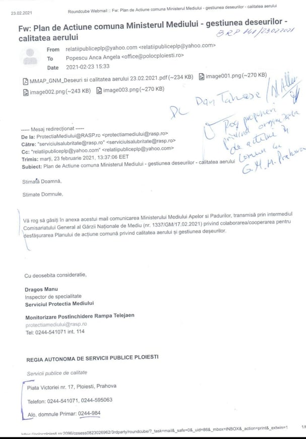 La data de 23.02.2021, Garda de Mediu Prahova a inaintat o adresa catre UAT Ploiesti, RASP Ploiesti si Politia Locala Ploiesti cu privire la “Plan de Actiune comuna Ministerul Mediului- gestiunea deseurilor-calitatea aerului” comunicata de Ministerul Mediului Apelor si Padurilor, transmisa prin intermediul Comisariatului General al Garzii Nationale de Mediu (nr.1337/GM/17.02.2021), prin care s-a informat ca pe teritoriul Municipiului Bucuresti se desfasoara incepand cu luna februarie a acestui an o actiune comuna privind calitatea aerului si gestiunea deseurilor la care particpa comisari ai Garzii Nationale de Mediu, reprezentanti ai Politiilor Locale ale Sectoarelor Municipiului Bucuresti si repreznetanti ai Unitatilor teritorial-administrative ale sectoarelor Municipiului Bucuresti si a solicitat analizarea oportunitatii desfasurarii unor astfel de actiuni impreuna cu reprezentanti ai Comisariatelor Judetene ale Garzii de Mediu si ai Politiilor Locale ale municipiilor resedinta de judet.