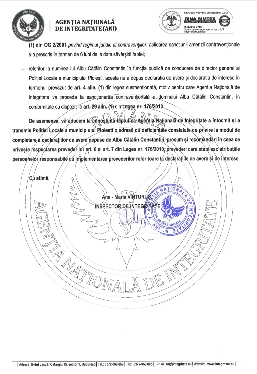 „referitor la numirea lui Albu Catalin Constantin in functia publica de conducere de director general al Politiei Locale Ploiesti , acesta NU a depus declaratia de avere si declaratia de interese in termenul prevazut de art 6 alin 1 din Legea susmentionata, motiv pentru care A.N.I va proceda la sanxtionarea contraventionala a domnului Albu Catalin Constantin, in conformitate c u dispozitiile art 29(1) din Legea nr 176/2010. ”