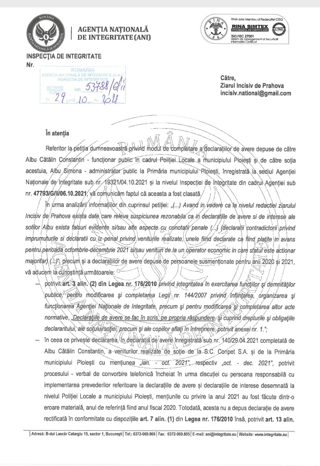 La data de 03.10.2021, Incisiv de Prahova publica articolul “Incredibilele falsuri grosolane in declaratiile de avere si interese ale “famigliei” Albu care conduce Ploiestiul (Albu Simona – city-manager si Albu N.Catalin Constantin – plantat director general la Politia Locala Ploiesti)”.