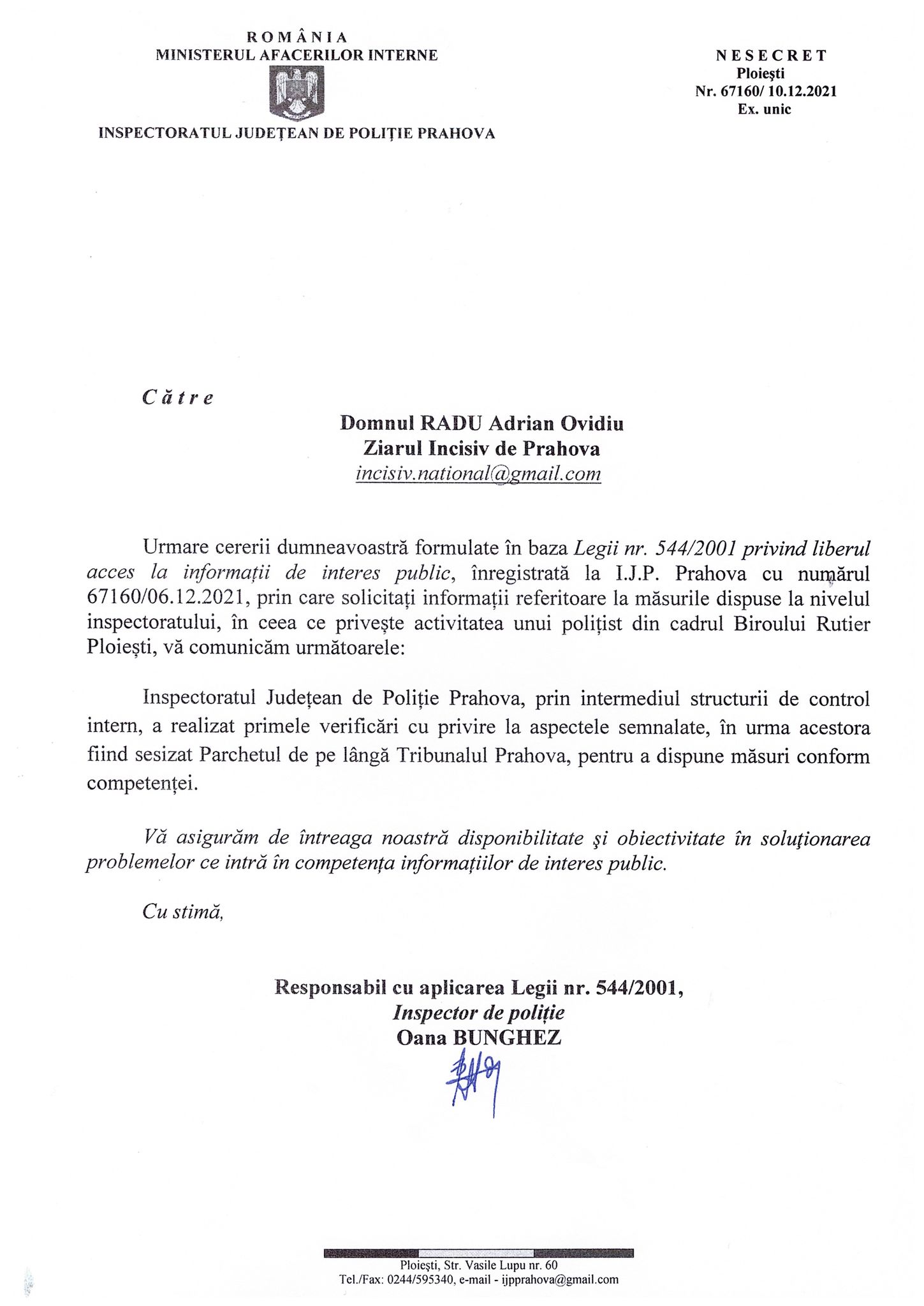 La doar cateva ore, conducerea IPJ Prahova ne-a informat, in mod profesional si operativ, ca… va demara verificarile specifice prin serviciul de control intern si o sa ne comunice cele constatate, aspecte inserate in articolul din aceeasi zi „Reactie prompta a conducerii IPJ Prahova la articolul nostru „Pentru o „pasarica”, „cocoselul” Palas Cristinel Tiberius Marius de la Serviciului Rutier al I.J.P.Prahova (Biroul Rutier Ploieşti) s-a transformat intr-un interlop – infractor/Hartuire, abuz in serviciu si manevrarea ilegala a datelor cu caracter personal”.