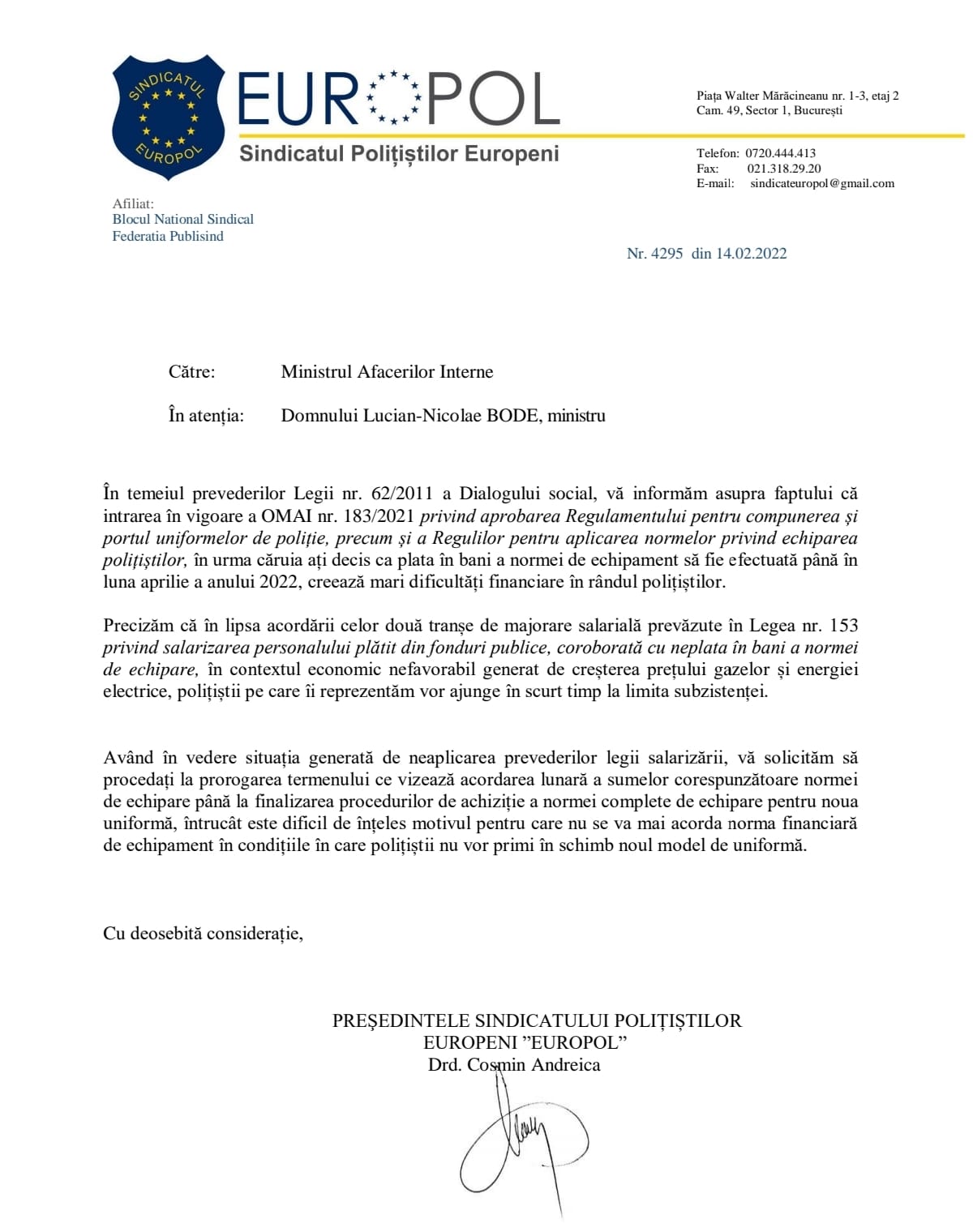 Solicitarea organizației noastre vine ca urmare a neaplicării în integralitate a prevederilor legii salarizării, precum și din cauza lipsei de preocupare a decidenților politici cu privire la mult-trâmbițata acordare a sfertului din cele două tranșe restante, adică o sumă de aproximativ 150 lei, sumă care nici măcar nu acoperă pierderile pe care le vor suferi polițiștii din luna aprilie, după ce norma financiară de echipament, de aproximativ 250 lei nu va mai fi plătită către polițiști, precizeaza cei de la sindicatul Europol.