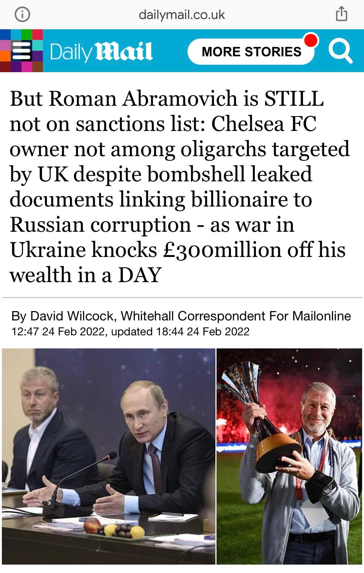 Tovarasul lui Putin, oligarhul Abramovich, printre altele, proprietarul clubului de fotbal FC Chelsea nu este inca pe lista celor vizati de sanctiunile anuntate in seara asta din Downing Street! “De indata, imediat…”, dar selectiv puncteaza sursa citata! (Cristina T.).