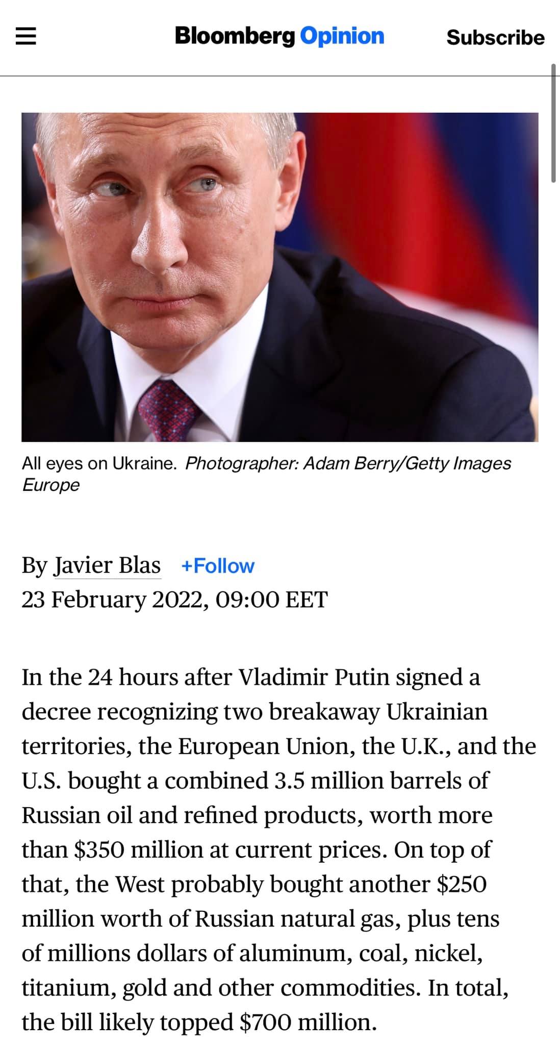 Germania cica se lupta cu Rusia si a anuntat suspendarea NordStream 2 dupa recunoasterea independentei celor 2 regiuni ucrainene! Despre sora NordStream 1, perfect functionala si care urmeaza acelasi traseu ca NordStream2 nu sufla o vorbulita! Una e teoretica si goala, cealalta exista, e plina si cara gaz la capacitate maxima! Chiar si dupa semnarea decretului, dincolo de sanctiunile anuntate, afacerile dintre Occident si Rusia sunt neclintite! Cititi o analiza cu datele pe masa in Bloomberg, mai precizeaza acesta!