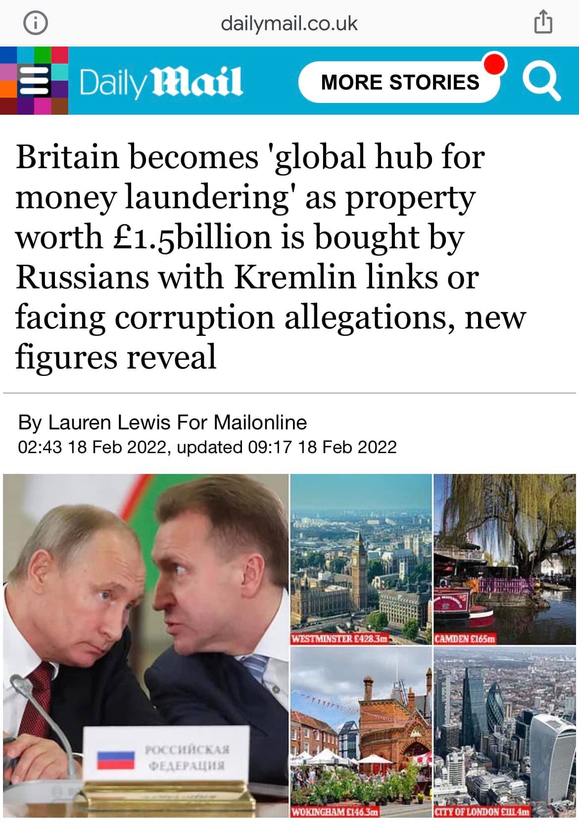Ia uitati ce scria DailyMail acum cateva zile: Marea Britanie devine “un hub global pentru spalarea de bani” in timp ce proprietati de peste 1.5 miliarde de lire sterline sunt cumparate de rusi cu legaturi la Kremlin sau confruntati cu fapte de coruptie! Si asta nu e o analiza generala, exhaustiva, pe ultimii 10 ani sa spunem ci o fotografie de moment! Oligarhii rusi sunt cei care au propulsat piata imobiliara din UK la cele mai mari cote din istorie, au cumparat cluburi de fotbal, tot felul de afaceri prin tot felul de circuite fiscale putrede! Unde au fost autoritatile? In asta a constat puterea regimului lui Putin! Toata lumea a fost de vanzare si acum flutura niste firave sanctiuni care URMEAZA SA intre in functiune! Nimic exact, nimic concret, dezvaluie jurnalistul Ionut Cristcahe!