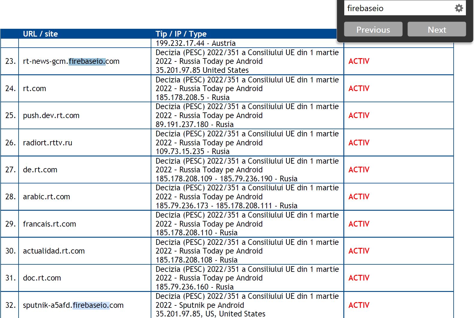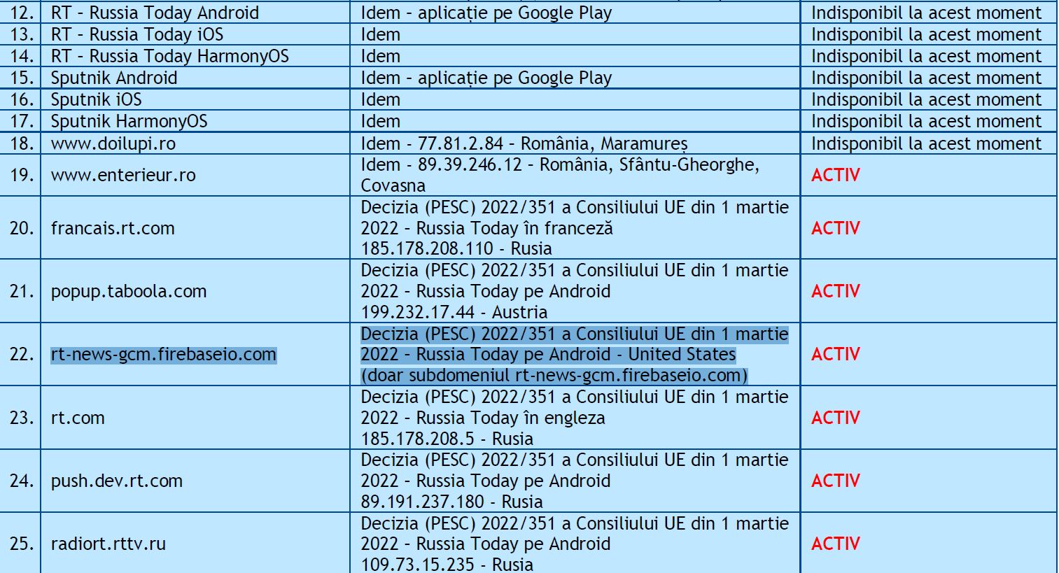 • Așa cum se poate observa și din toate aceste liste transmise către ANCOM și publicate transparent pe site-ul dnsc.ro, cele două subdomenii au fost propuse pentru blocare în baza Deciziei (PESC) 2022/351 a Consiliului UE din 1 martie 2022.