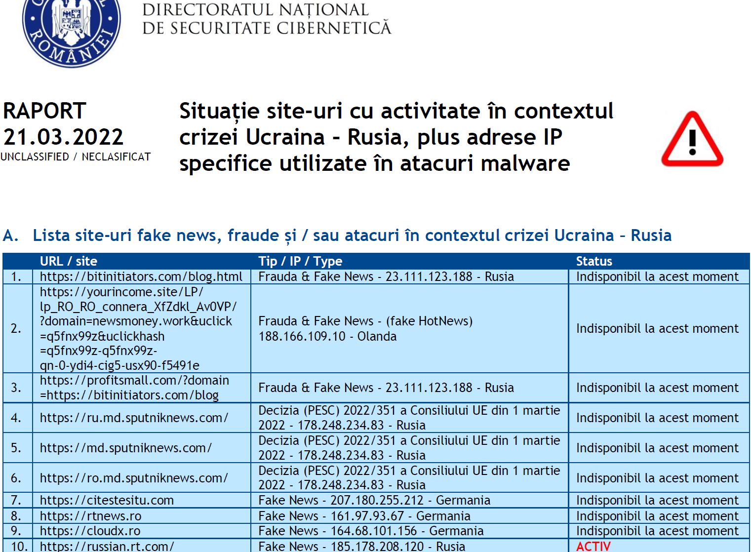 Pe de altă parte, în cea mai nouă listă cu site-urile fake news și IP-uri cu malware, publicată în 21 martie 2022, DNSC nu a mai publicat adresa IP, ci doar a precizat că dorește blocarea subdomeniilor respective.