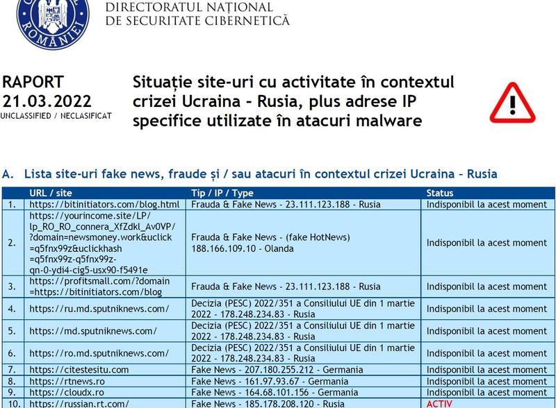 • „Directoratul Național de Securitate Cibernetică (DNSC) a inclus în data de 09.03.2022 pe lista de site-uri transmisă către Autoritatea Națională pentru Administrare și Reglementare în Comunicații (ANCOM) subdomeniile rt-news-gcm.firebaseio.com, respectiv sputnik-a5afd.firebaseio.com, aferente Russia Today și Sputnik.
