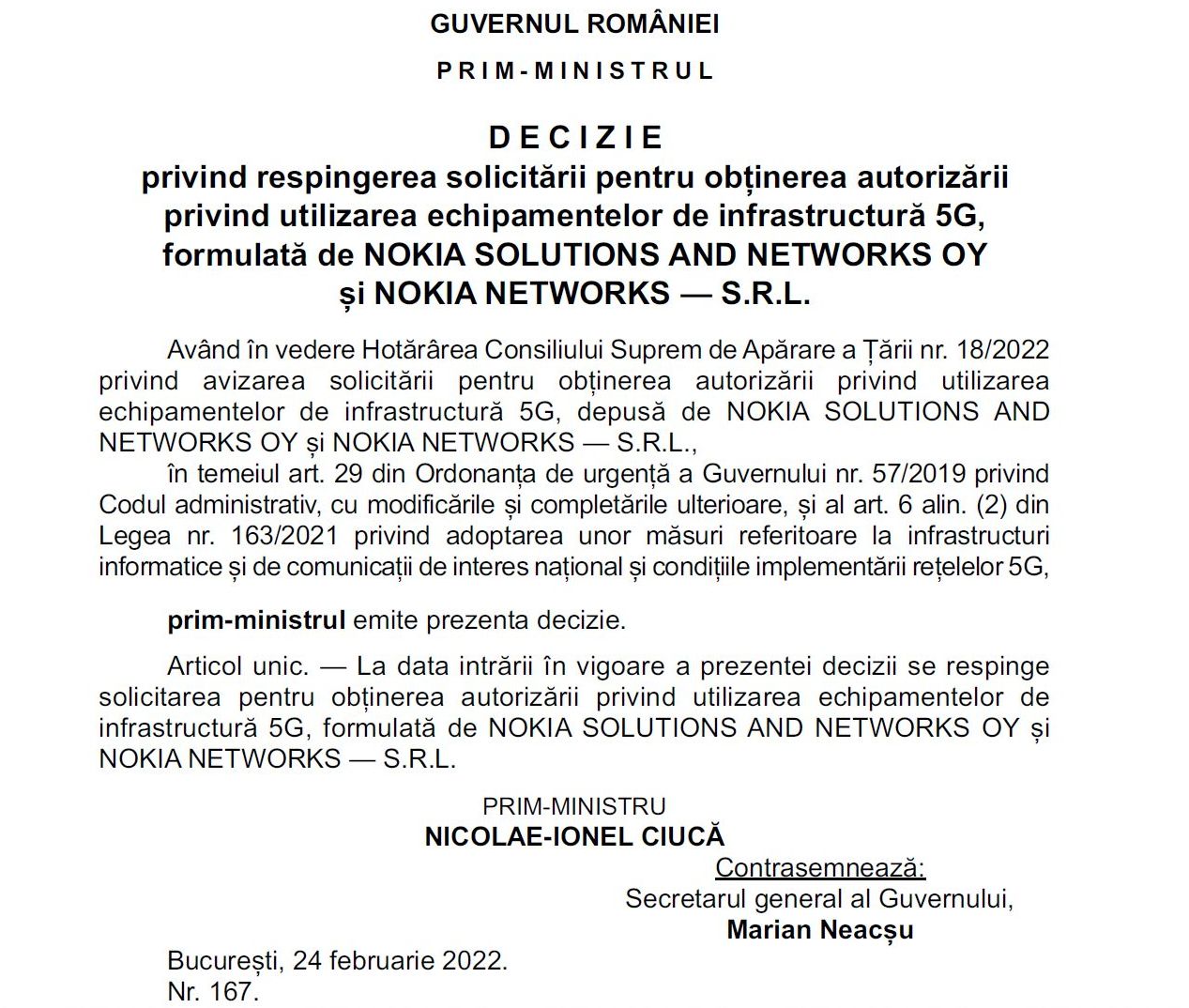 Hotărârea CSAT emisă în acest an nu este motivată, dar pe baza acesteia premierul Nicolae Ciucă a semnat joi o decizie publicată acum în Monitorul Oficial, care va împiedica cele două companii să participe pe viitor în construcția rețelelor 5G din România.