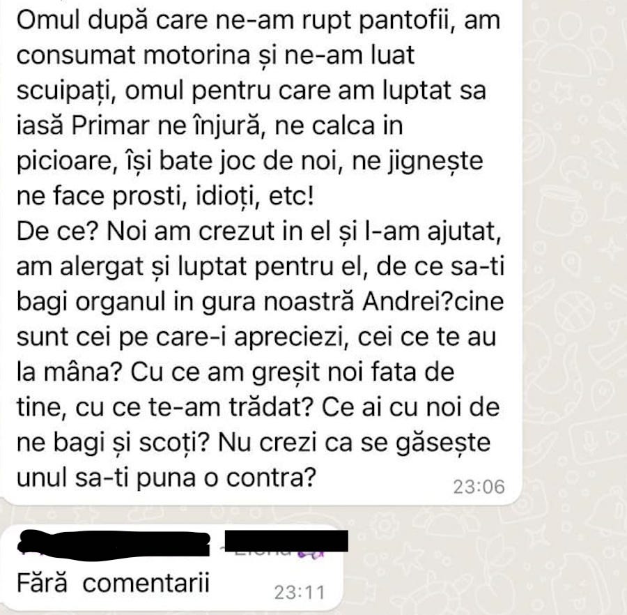 „De ce? Noi am crezut in el și l-am ajutat, am alergat și luptat pentru el, de ce sa-ti bagi organul in gura noastră Andrei?cine sunt cei pe care-i apreciezi, cei ce te au la mâna? Cu ce am greșit noi fata de tine, cu ce te-am trădat? Ce ai cu noi de ne bagi și scoți? Nu crezi ca se găsește unul sa-ti puna o contra?”