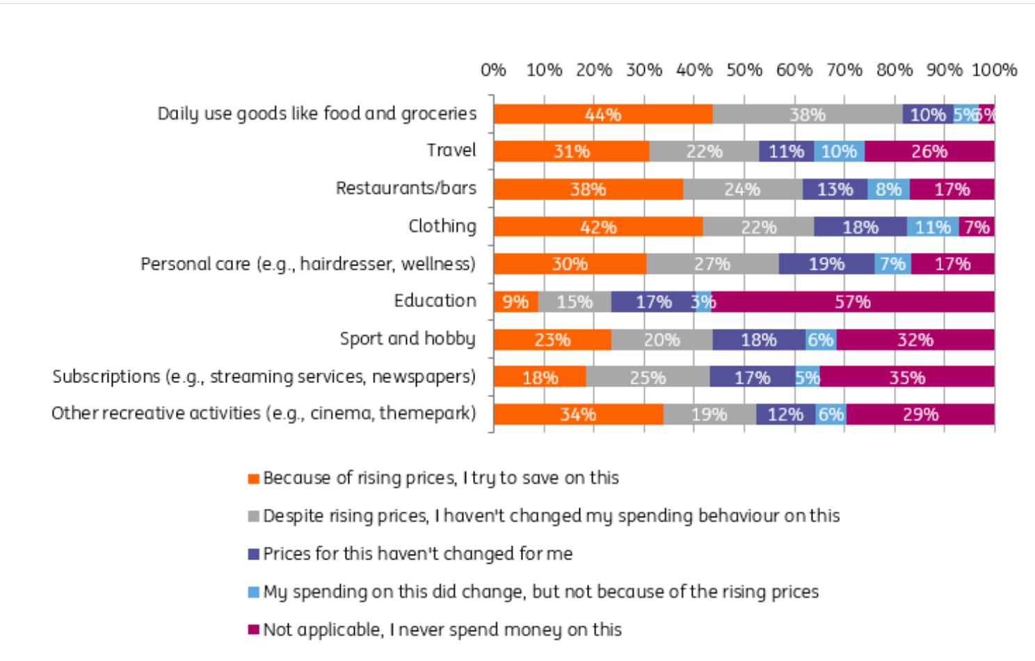 Potrivit sondajului ING, circa trei sferturi din familiile de belgieni (73%) resimt direct creșterea costurilor cu energia. Pentru a face față acestui lucru, belgienii au început să-și limiteze consumul de energie, jumătate dintre ei reducând încălzirea în locuință, în vreme ce o treime spun că și-au redus utilizarea unor aparate electronice (mașină de spălat vase, uscător de rufe, televizor etc.).