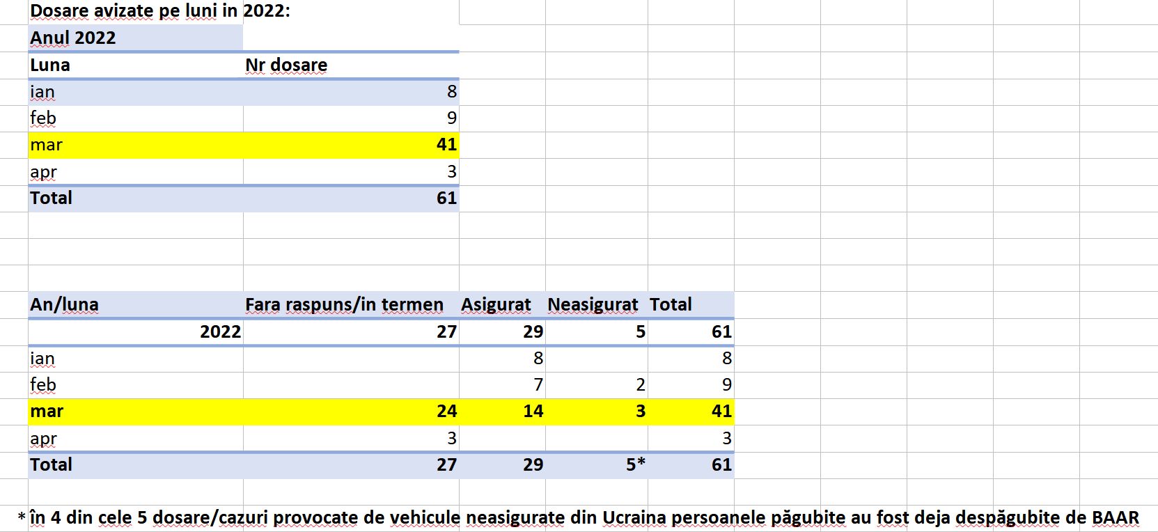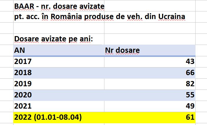 Astfel, în doar 3 luni din anul curent s-au înregistrat 61 de dosare avizate de BAAR pentru accidente produse în România de vehicule din Ucraina, peste numărul de dosare în tot anul 2021, ori 2020.