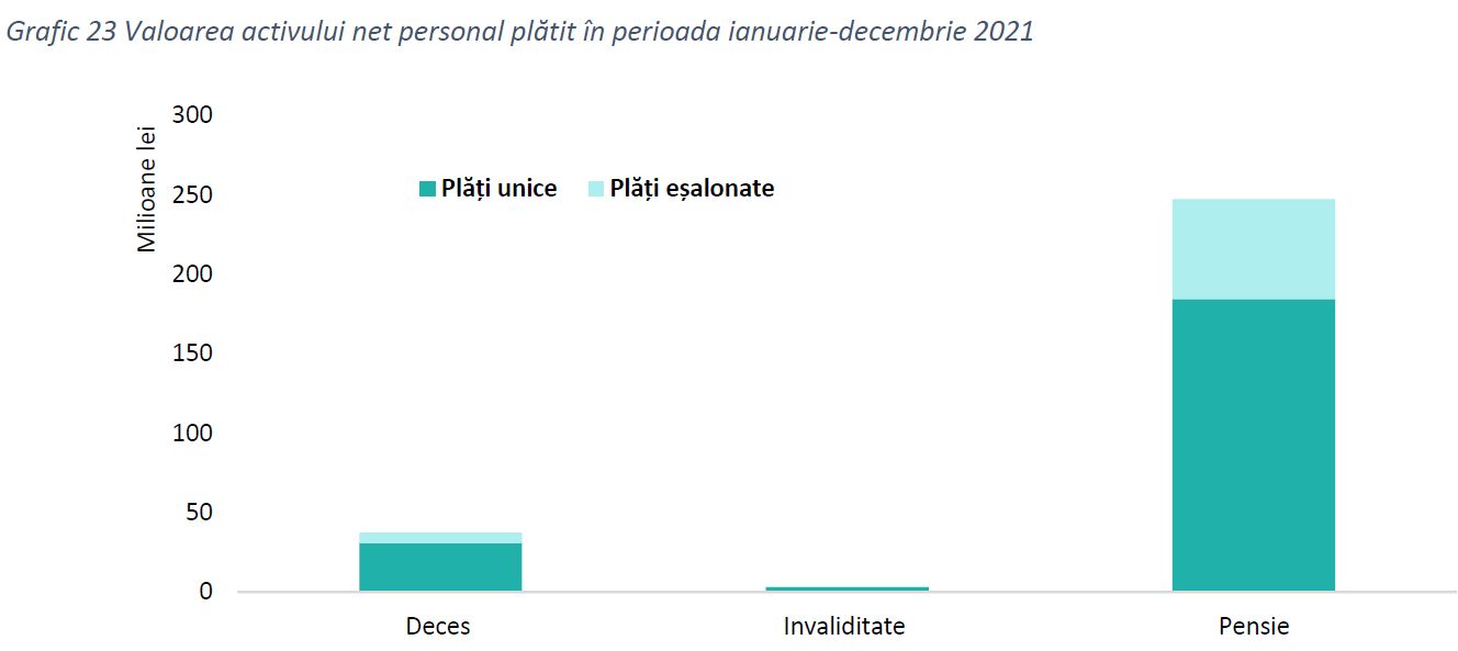 În perioada ianuarie-decembrie 2021 au fost efectuate plăți ale activului personal net în valoare de circa 288 milioane lei către 19 mii de participanți sau beneficiari. Din valoarea totală a plăților efectuate, un procent de 86% este aferent deschiderii dreptului la pensie, 13% ca urmare a decesului participantului și 1% ca urmare a invalidității.