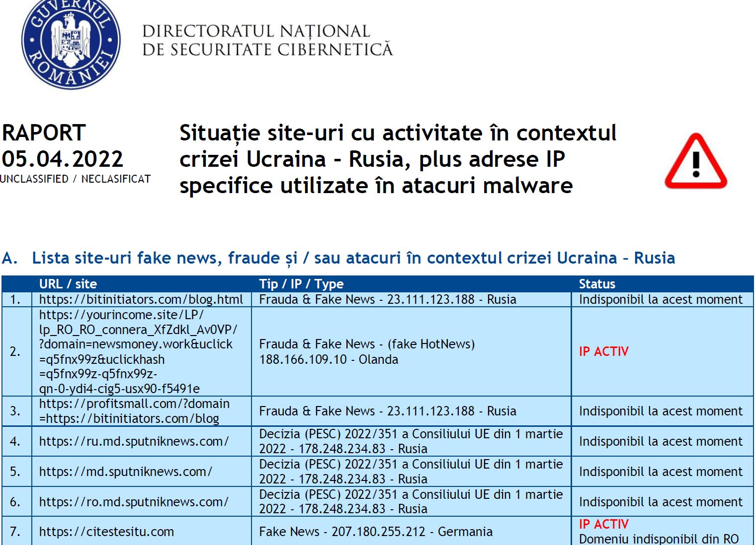 Cea mai recentă listă cu site-uri de fake news și adrese IP care ar putea fi utilizate la atacuri publicată pe site-ul DNSC este din 5 aprilie 2022.