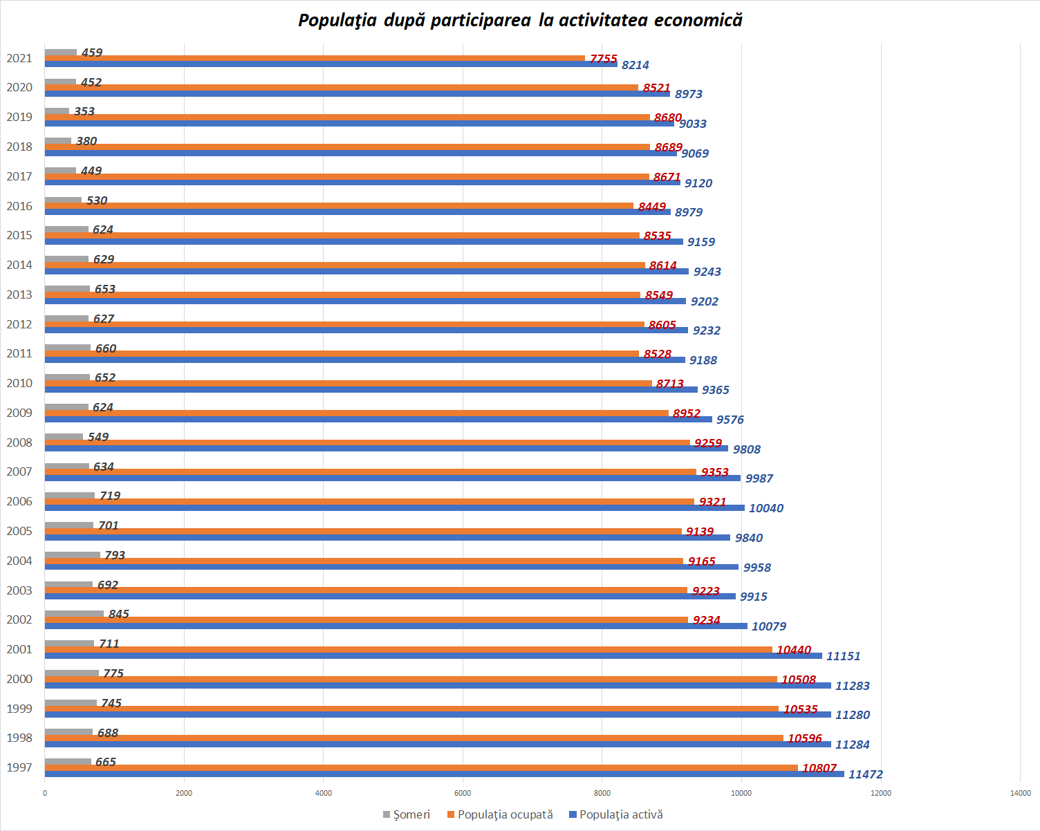În anul 2021 populaţia activă a României era de 8,2 milioane de persoane, din care 7,75 milioane erau persoane ocupate şi 459 mii erau şomeri, a transmis miercuri Institutul Național de Statistică. Față de acum 20 de ani, suntem cu 1,9 milioane mai puțini români activi economic, iar numărul șomerilor este același cu cel din 2007, mai arată datele INS.