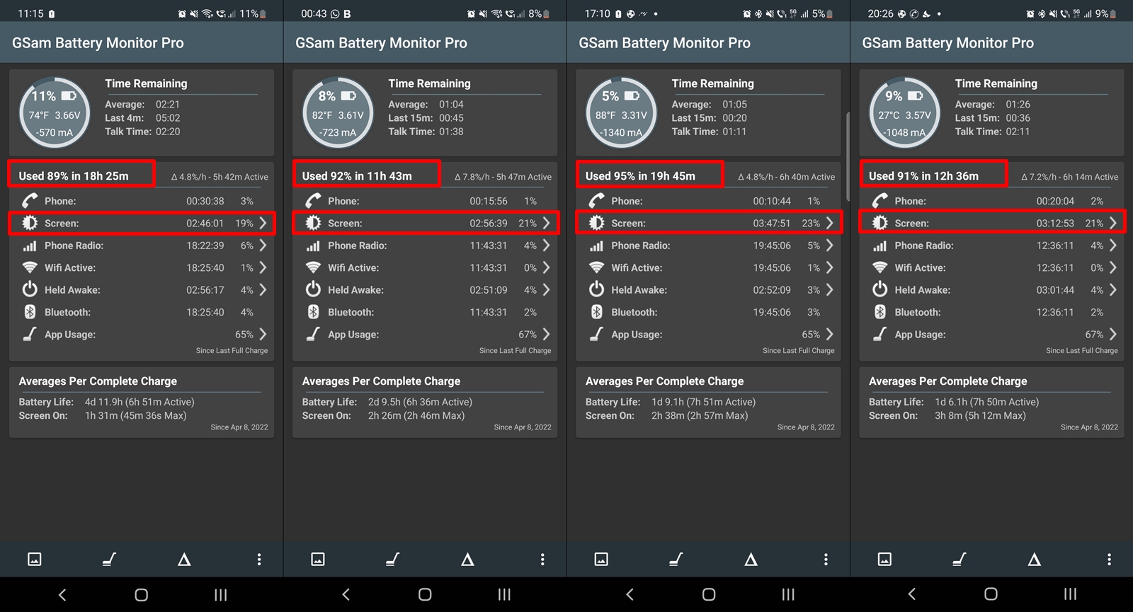 Ecranul a fost setat pe modul adaptiv 120 Hz și a avut activată funcția „Dark Mode” care presupune fundaluri închise în multe zone din meniu. Funcția „Battery Saver” a fost activată doar în cazurile extreme când ajungeam sub 5% cu bateria.