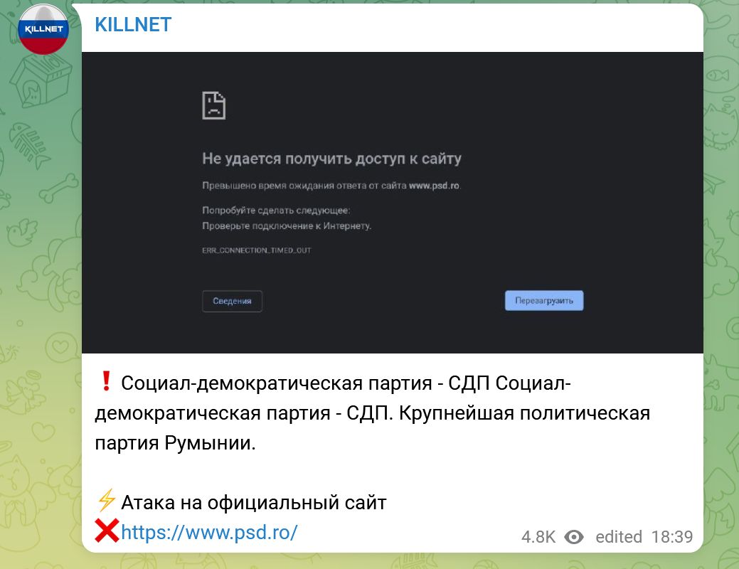 ​Grupul de hackeri pro-Rusia Killnet revendică vineri încă un atac, de această dată asupra site-ului web al Partidului Social Democrat (PSD), care cel puțin la acest moment nu poate fi accesat. Amintim că hackerii Killnet au făcut inaccesibile vineri mai multe site-uri guvernamentale, inclusiv al Guvernului și Ministerului Apărării, pe motiv că Marcel Ciolacu ar fi promis Kievului „asistență maximă” în furnizarea de arme letale.