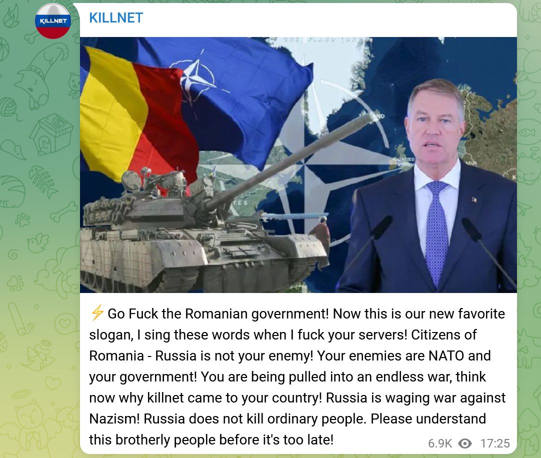 • „Cetăţeni ai României – Rusia nu este inamicul tău! Dușmanii tăi sunt NATO și guvernul tău! Ești atras într-un război fără sfârșit, gândește-te acum de ce a venit Killnet în țara ta! Rusia poartă război împotriva nazismului! Rusia nu ucide oameni obișnuiți. Vă rog să înțelegeți acest popor frățiș înainte de a fi prea târziu!”, se arată în mesajul de pe Telegram.