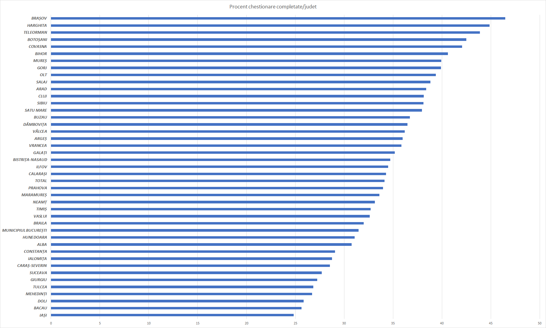 Județul Brașov stă cel mai bine, pomderea chestionarelor completate fiind de peste 46%. Brașovul e ormat la mică distanță de Harghita, Teleorman, Botoșaniși Covasna. La capătul celălalt al clasamentului găsim Iașiul (sub 25%), urmat de Bacău, Dolj și Mehedinți.