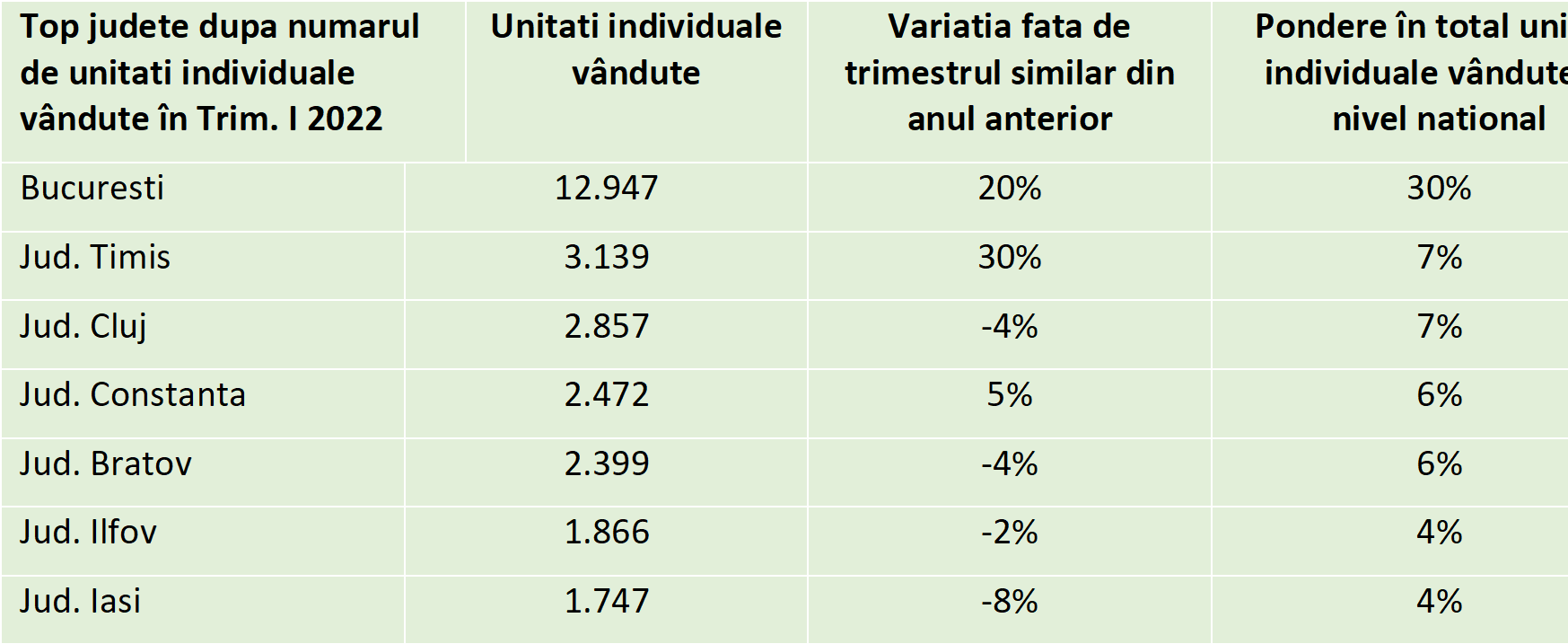 În primul trimestru s-au vândut 42.657 de unități individuale la nivel național, comparativ cu perioada similară din 2021 când s-au vandut 40.043 unități. Creșterea a fost susținută de București, împreună cu județele Timiș și Constanța, cu creșteri de 20%, 30%, respectiv 5% față de trimestrul întâi din 2021. Celelalte județe importante au înregistrat scăderi ale unităților vândute, cea mai importantă fiind înregistrată în județul Iași, -8%.