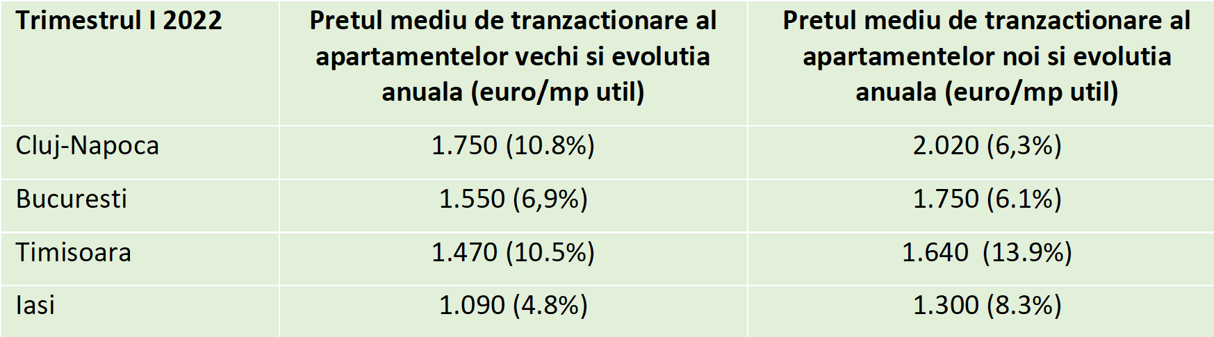 În piața secundară, Cluj-Napoca și Timișoara au cunoscut cel mai semnificativ avans anual, 11%, urmate de București, 7%, respectiv Iași, aproximativ 5%. Prețul mediu de tranzactionare al apartamentelor în piața primară s-a majorat cu valori cuprinse între 6% (București) și 14% (Timișoara).