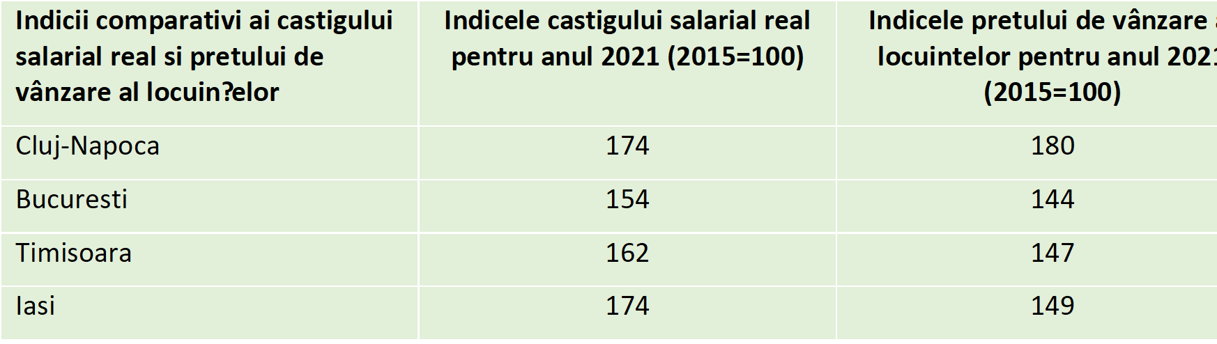 În Cluj-Napoca prețurile de vânzare ale apartamentelor s-au apreciat cu 80%, în termeni reali, în perioada 2015 – 2021, depășind creșterile salariului mediu net (de 74%). Și în celelalte trei orașe mari analizate de ValorEasy (București, Iași și Timișoara) prețurile au crescut, dar nu au depășit creșterile salariilor.