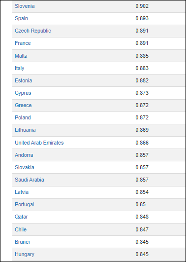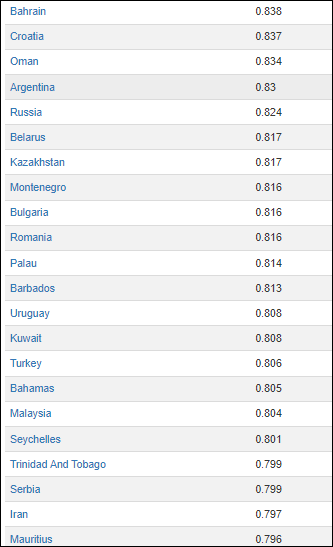 Locul 54 la nivel global, cu o valoare de 0,816, după Bulgaria (locul 53 , tot 0,816), după Rusia (locul 49-0,824) și Belarus (locul 50-0,817). Croația este pe locul 46, Ungaria pe 44 (0,845), Slovacia pe 37 (0,857), Polonia pe 33 (0,872), la egalitate cu Grecia