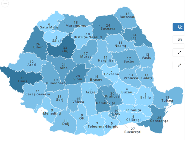 Timiș (35), Cluj (33) și Sibiu (28) sunt județele în care se construiesc cele mai multe locuri de joacă. Cu 27 de locuri de joacă, Bucureștiul este urmat de județele Bihor (cu 26 de locuri de joacă noi) și Constanța (25 locuri de joacă).