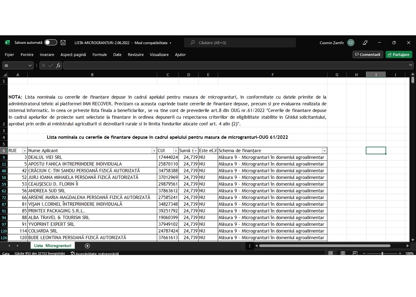 LISTA preliminară a firmelor calificate la microgranturile de 5.000 EUR fiecare- ultimul număr RUE care prinde buget momentan
