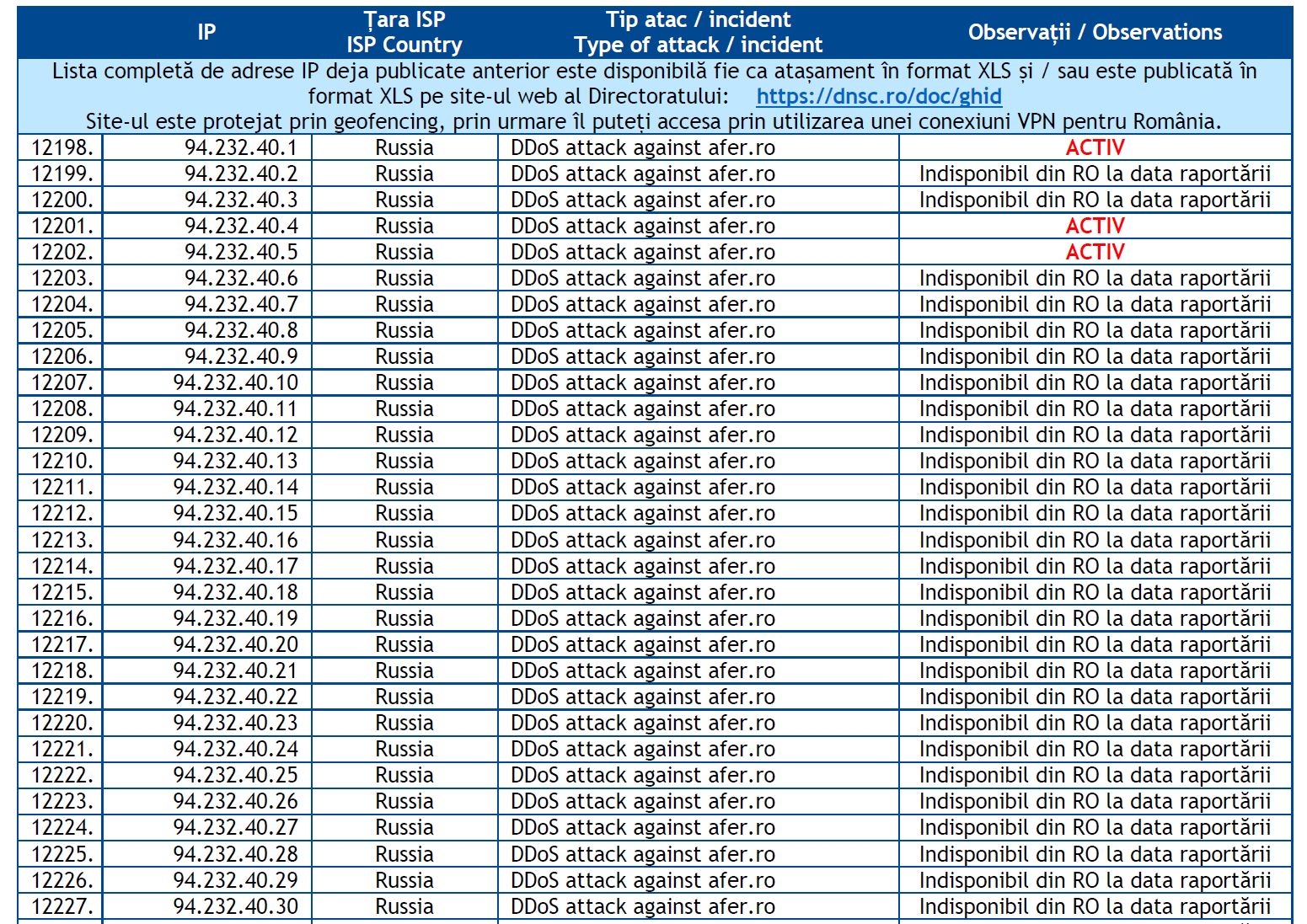 În raportul DNSC sunt menționate multe atacuri DDOS împotriva site-ului afer.ro, de la adrese provenind din Rusia, dar și atacuri împotriva site-ului MAPN, versiunea în engleză – https://english.mapn.ro/.