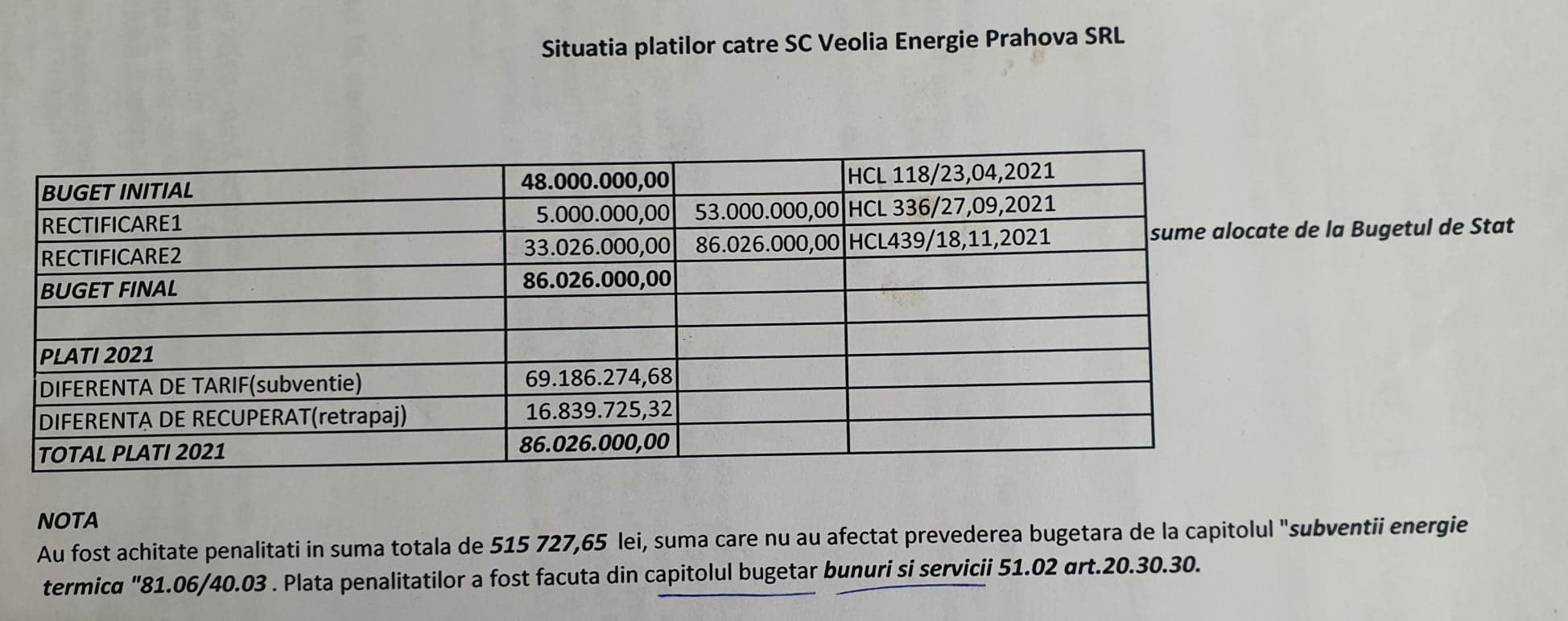 In urma adresei si notificarii transmisa de firma franceza primariei si inregistrata la aceasta enitate sub nr 23526 din 27 octombrie 2021, primarul Andrei Volosevici cu o graba care acum se explica si prin iminenţa punerii sub inculpare a sa, a trecut la calcularea penalitatilor, in suma de 515.727,95 ron reprezentand subventii energie termica din capitolul 81.06/40.03.
