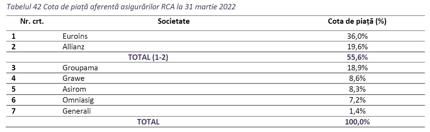 ASF spune că la finalul primului trimestru al anului 2022, gradul de concentrare se menține ridicat pentru primii asigurători din top, astfel că primii 2 asigurători (Euroins și Allianz) cumulau aproximativ 55,6% din portofoliul de asigurări RCA din România.