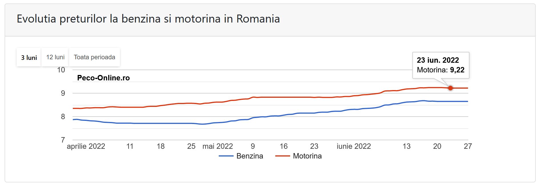 Potrivit datelor aplicației online Peco-online.ro, „comparativ cu luna trecută, prețul mediu al unui litru de benzină s-a majorat cu 5.1%, ceea ce înseamnă ca un plin (50 de litri) costă astăzi cu 21.0 lei mai mult decât în urma cu 30 de zile, iar în cazul motorinei, prețul mediu al unui litru a crescut cu 4.3%, ceea ce înseamnă că un plin (50 de litri) costă astăzi cu 19.0 lei mai mult decât în urma cu 30 de zile.