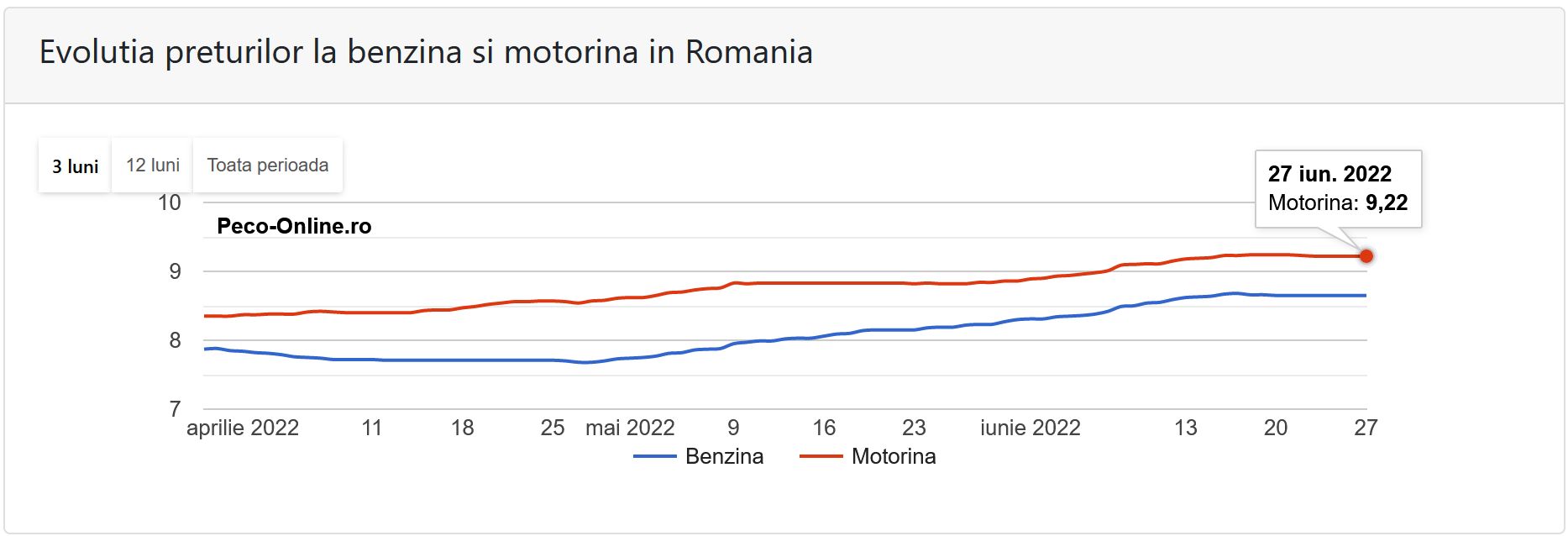 Potrivit datelor aplicației online Peco-online.ro, „comparativ cu luna trecută, prețul mediu al unui litru de benzină s-a majorat cu 5.1%, ceea ce înseamnă ca un plin (50 de litri) costă astăzi cu 21.0 lei mai mult decât în urma cu 30 de zile, iar în cazul motorinei, prețul mediu al unui litru a crescut cu 4.3%, ceea ce înseamnă că un plin (50 de litri) costă astăzi cu 19.0 lei mai mult decât în urma cu 30 de zile.