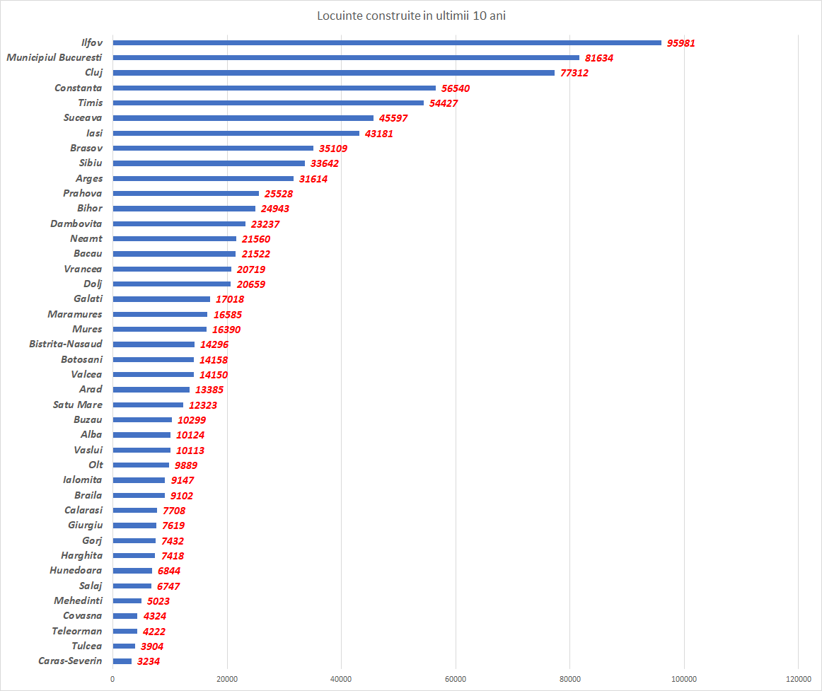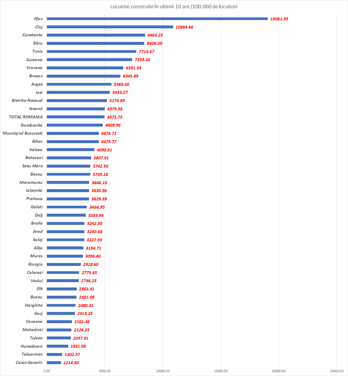Sigur că numărul de locuințe construite depinde și de populația din fiecare județ. Dacă ne uităm la locuințele nou construite în ultimii 10 ani, la suta de mii de locuitori, clasamentul se schimbă.