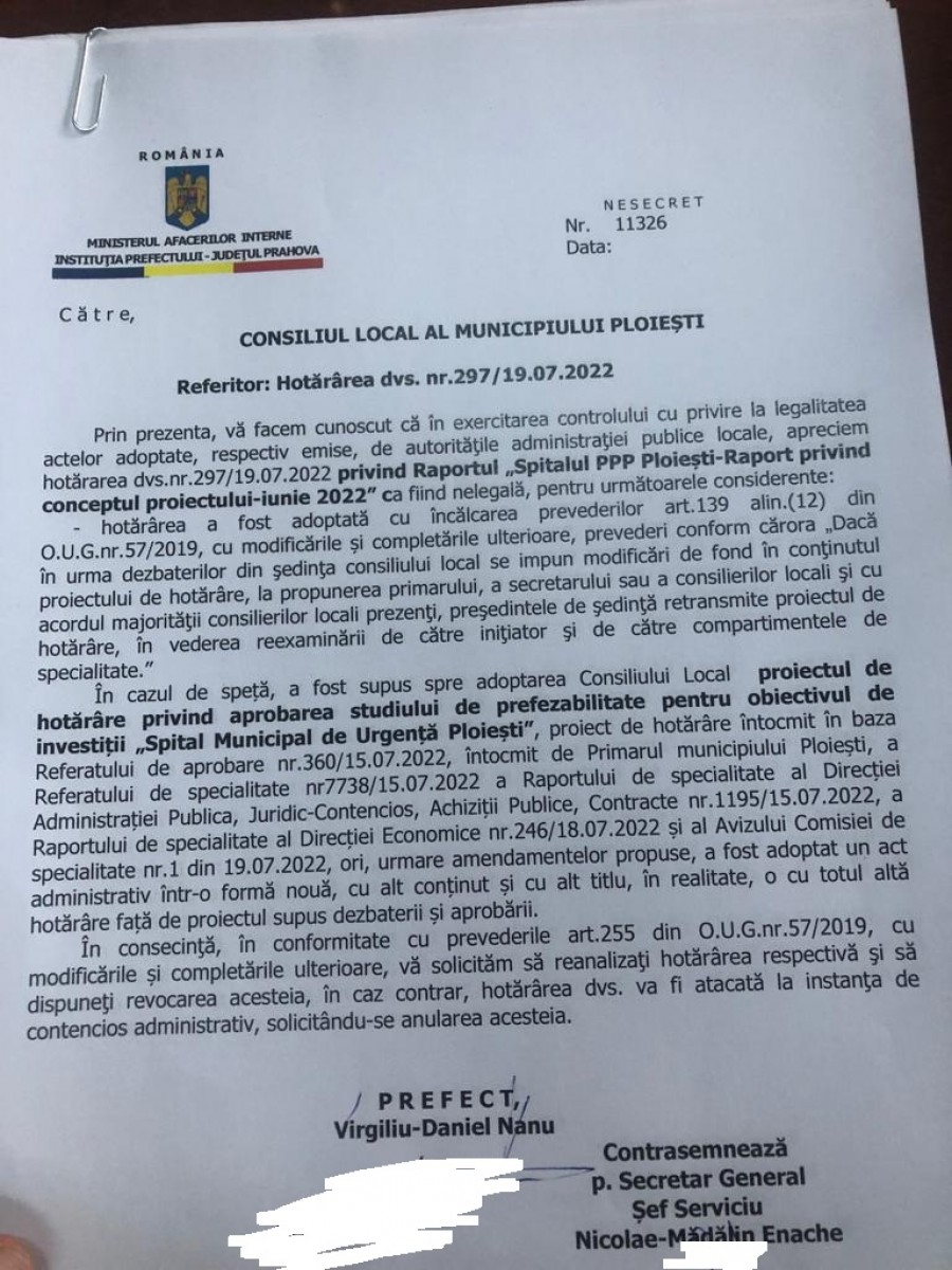 Din păcate, gestul Prefecturii Prahova nu face altceva decât să întârzie continuarea procedurilor necesare demarării construcției spitalului municipal”.