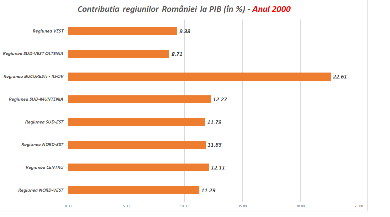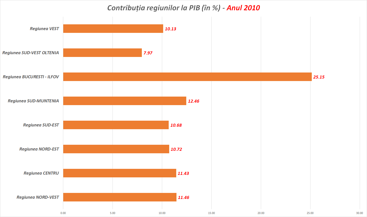 Ca o situație intermediară, mai jos aveți contribuția regiunilor la PIB (în %) în anul 2010: