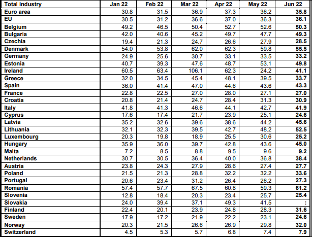 Cu 61,2% au crescut prețurile la poarta fabricii la noi în țară. a doua cea mai lovită de scumpiri piață din UE este danemarca, cu 55%. Ungaria are acest indicator la 45%, iar polonia la 33,6%. Cum, oare mai putem vorbi de competitivitatea companiilor noastre cu asemenea cifre? Media Uniunii este de 36%.