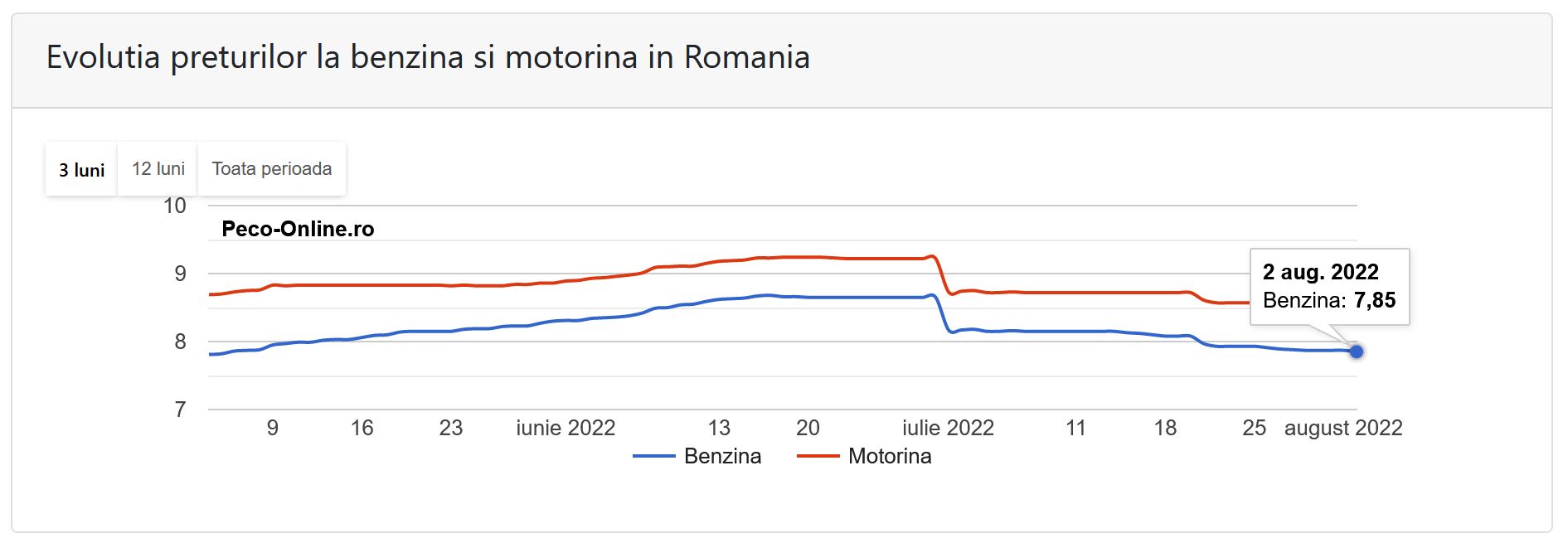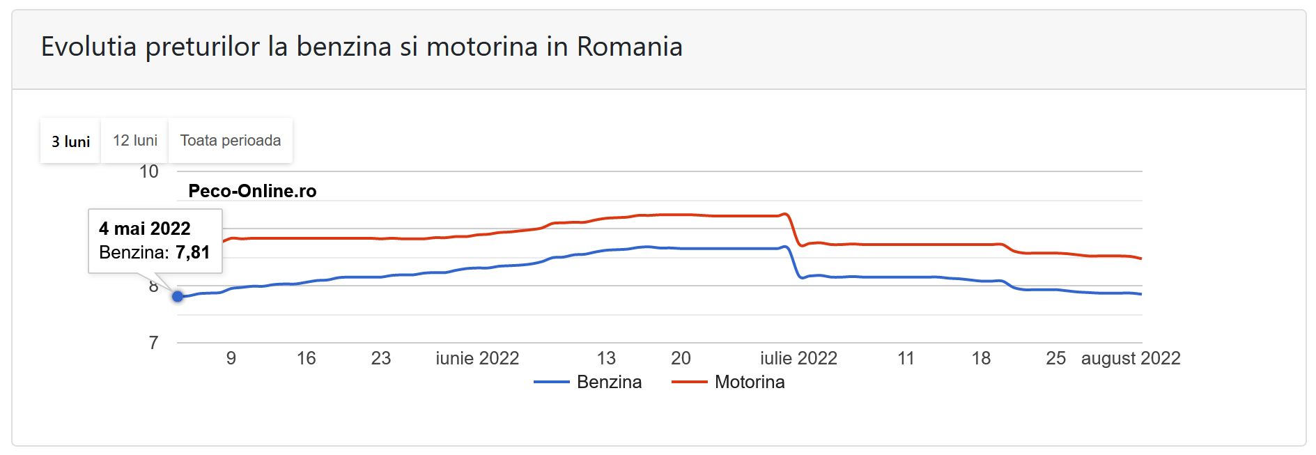 Astfel potrivit datelor Peco-online, în data de 4 mai 2022 prețul mediu al unui litru de benzină standard era de 7,81 de lei, în timp ce prețul mediu al unui litru de motorină standard era de 8,69 de lei.