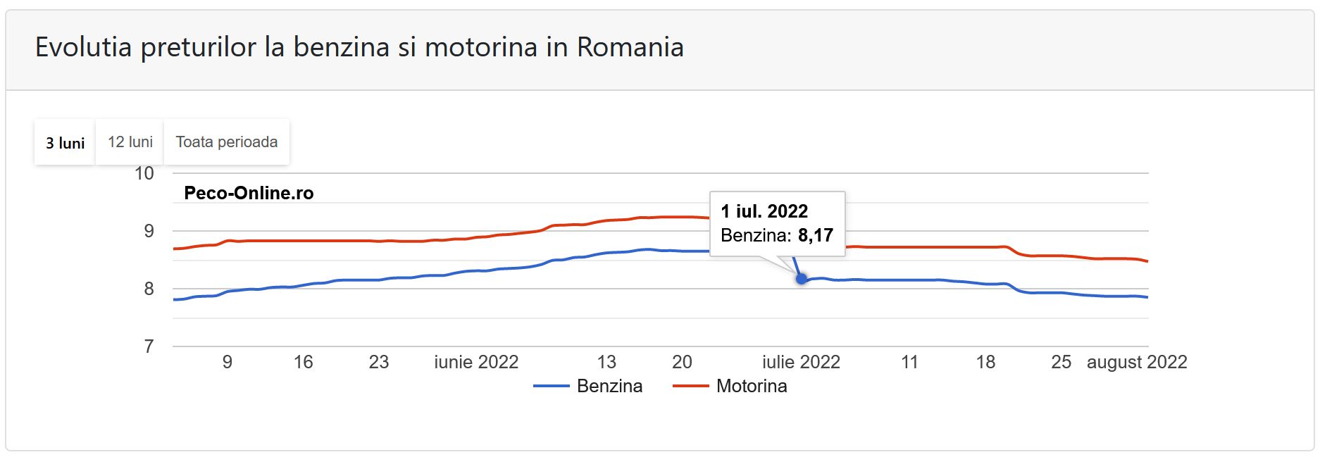 Datele Peco-online arată că prețul mediu al unui litru de benzină standard era de 8,17 lei în data de 1 iulie 2022, când a intrat în vigoare măsura de compensare cu 50 de bani la litrul de benzină.