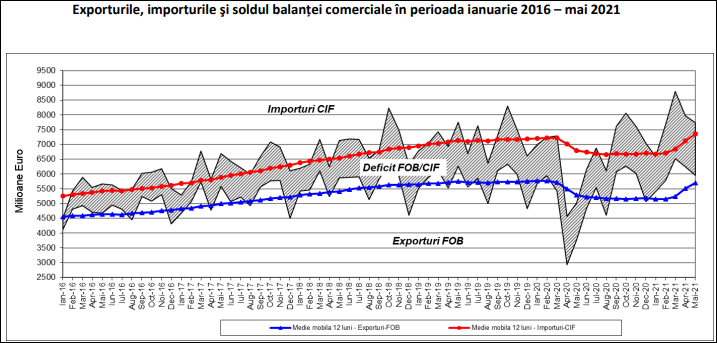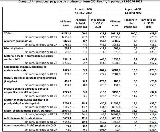 Deficitul balanţei comerciale (FOB/CIF) în perioada 1.I-30.VI 2022 a fost de 15,437 miliarde de euro, mai mare cu 4,740 miliarde de euro decât cel înregistrat în perioada 1.I-30.VI 2021. România a ajuns la importuri record și nimic nu mai poate opri creșterea deficitului comercial. Așa ceva nu s-a mai întâmplat niciodată în istoria țării și proporțiile acestui deficit devin catastrofice: