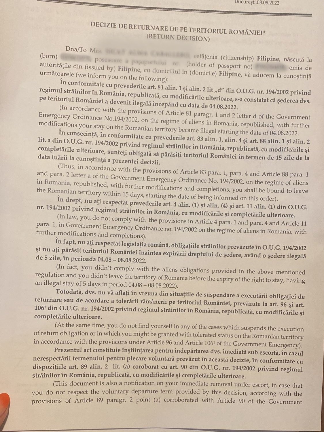 În cazul bonei, ea a fost dusă la Poliție, i s-a dat o amendă de 400 de lei și i s-a emis o decizie de părăsire a țării. Trebuie să părăsească țara în 15 zile. Au mai rămas câteva zile.