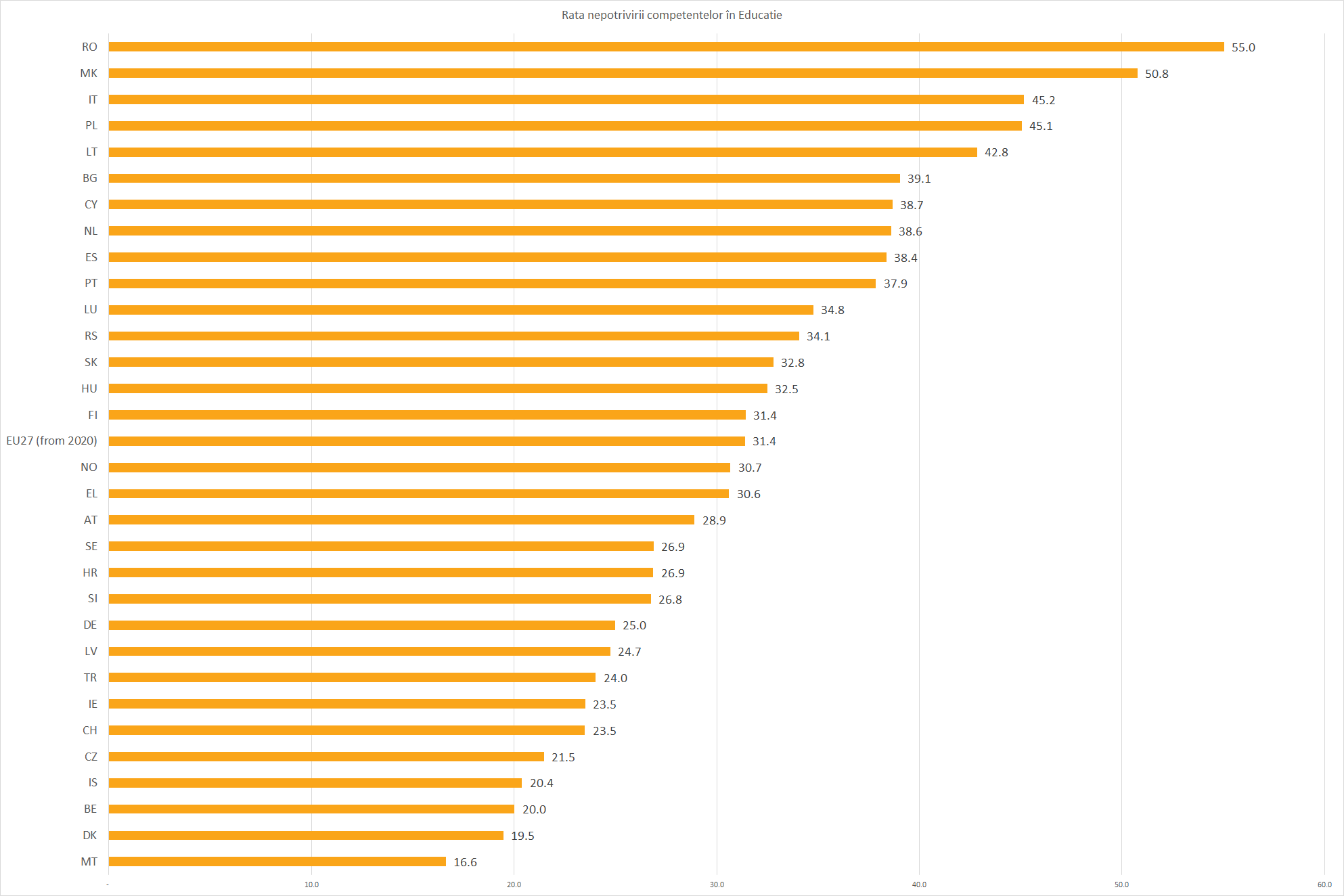 În Educație, suntem tot pe primul loc, cu un grad de nepotrivire de 55%. Suntem urmați de Macedonia, Italia și Polonia. La polul opus găsim Malta, Danemarca și Belgia.