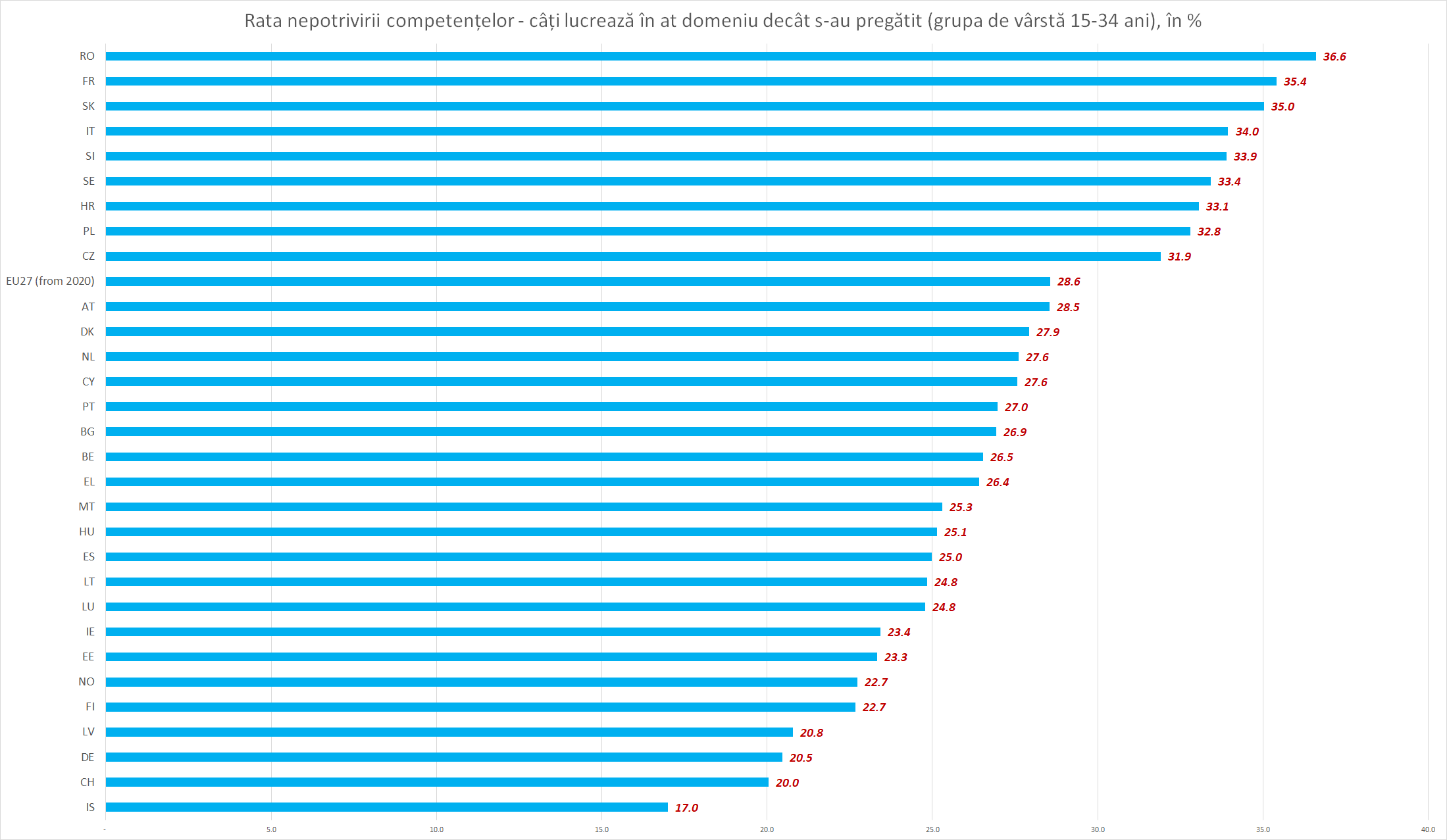 Rata nepotrivirii competențelor este definită ca discrepanța dintre ocupația curentă a unei persoane și domeniul în care s-a pregătit. La grupa de vârstă 15-34 de ani, potrivit unor statistici experimentale publicate de Eurostat, stăm cel mai prost la acest capitol. Persoanele care lucrează în alt domeniu din punct de vedere al educației primite sunt considerate persoane cu nepotrivire orizontală a competențelor.