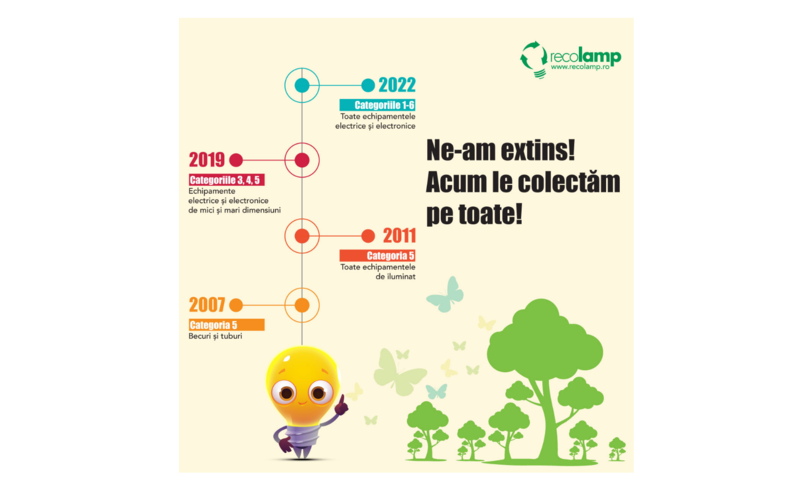 Astfel, după 15 ani de activitate consistentă pe piața colectării și reciclării deșeurilor din echipamente de iluminat, Asociația Recolamp își extinde activitatea la toate categoriile de DEEE- uri, prevăzute în legea nr. 5/2015, și anume: echipamente de transfer termic, ecrane, monitoare şi echipamente care conţin ecrane cu o suprafaţă mai mare de 100 cm2, echipamente de mari dimensiuni (având oricare dintre dimensiunile externe mai mare de 50 cm), echipamente de mici dimensiuni (nicio dimensiune externă mai mare de 50 cm), echipamente informatice şi de telecomunicaţii de dimensiuni mici (nicio dimensiune externă mai mare de 50 cm)