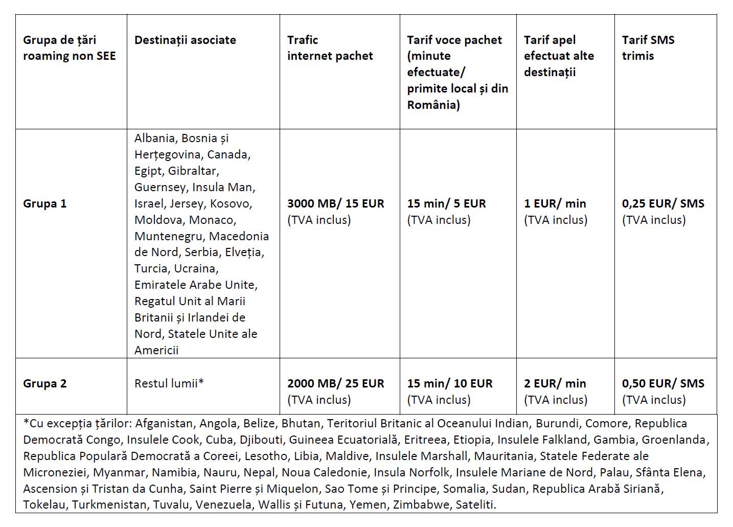 • 6. Tarifele de roaming în țările din afara Spațiului Economic European (non SEE) se modifică în conformitate cu informațiile din tabelul de mai jos. Pentru traficul de internet pe mobil și apelurile de voce primite și efectuate tarifarea se face pe bază de pachet. Tariful se aplică de la prima inițiere a unei sesiuni de date, respectiv apel de voce până la epuizarea pachetului. După epuizarea unui pachet se activează automat unul nou.