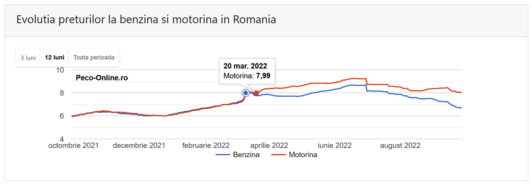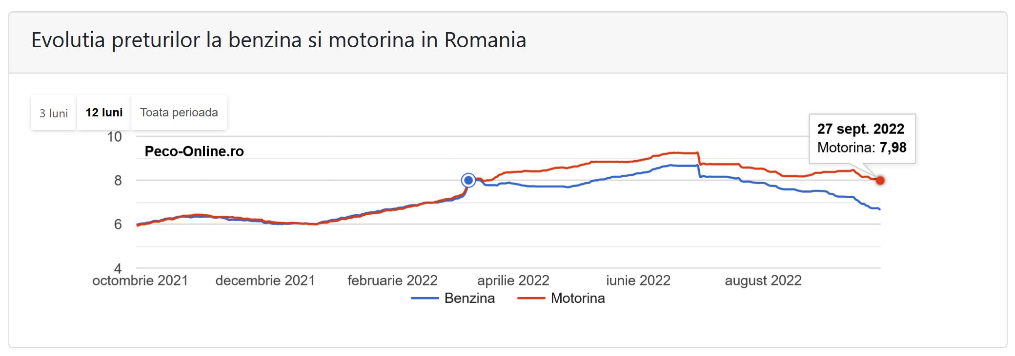 Conform datelor oferite de Monitorul Preţurilor, preţul mediu al benzinei standard în România, a fost pe 2 septembrie, de 7,39 lei/litru (cu reducerea de 50 de bani), iar pentru motorină prețul mediu a fost de 8,37 lei/litru (cu reducerea de 50 de bani). Pe data de 2 septembrie, tițeiul se tranzacţiona în jurul valorii de 93 dolari/baril, cu circa 20% mai mult decât valoarea de la începutul anului.