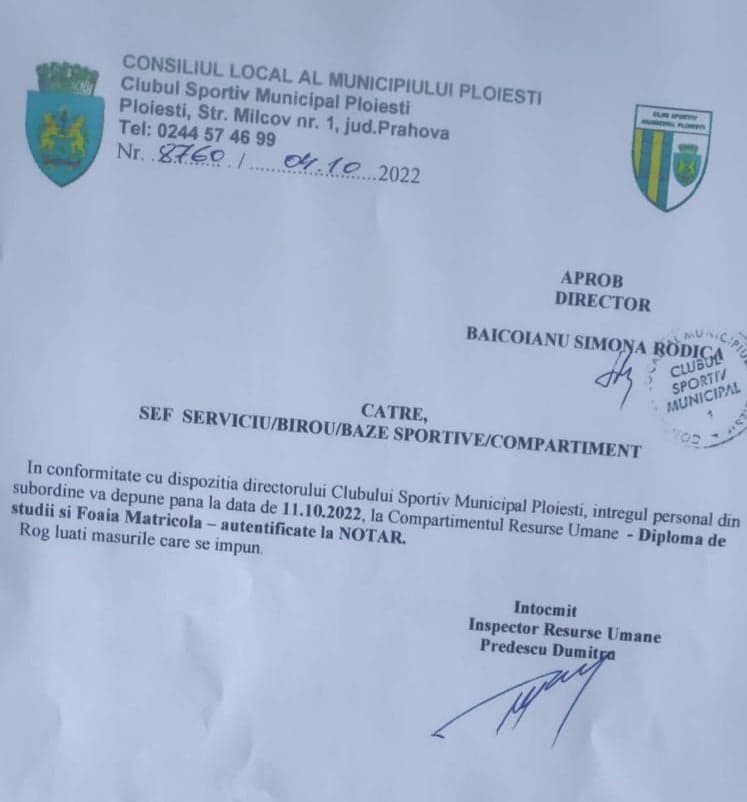„In conformitate cu dispozitia directorului Clubului Sportiv Municipal Ploiesti, intregul personal din subordine va depune pana la data de 11.10.2022, la Compartimentul Resurse Umane – Diploma de studii si Foaia Matricole – AUTENTIFICATE LA NOTAR”.