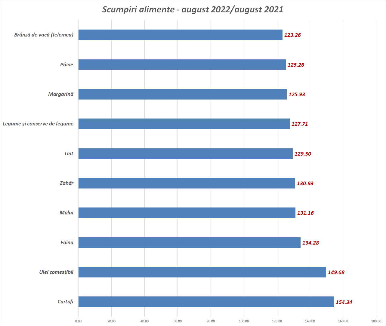 E drept, fiecare resimte altfel inflația, în funcție de alimentele preferate pe care le consumă. În august 2022, dacă îți plăceau cartofii prăjiți în ulei, plăteai scump pentru a-ți satisface pofta culinară. Față de august 2021, cartofii s-au scumpit cu peste 50%, iar uleiul cu aproape tot atât.