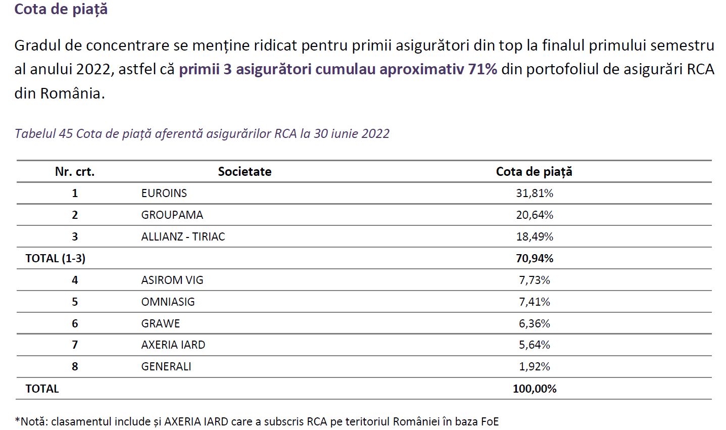 În plus, ultimul raport ASF aferent primului semestru din 2022, arată că Euroins avea la 30 iunie o cotă de piață de 31,81%, fiind urmată de Groupama (20,64%) și de Allianz-Țiriac (18,49%).